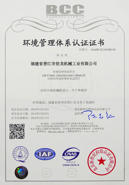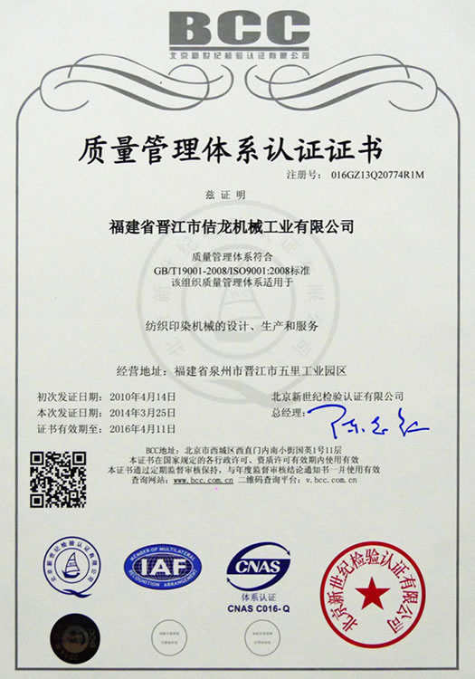 So far, our company has passed ISO9001 Quality Management System Certificate and ISO14001 Environment Management System Certificate. We are also a provincial High- and New-Tech Enterprise, an undertaking unit of China Torch Program and a reliable manufacture company of textile dyeing and printing equipment.